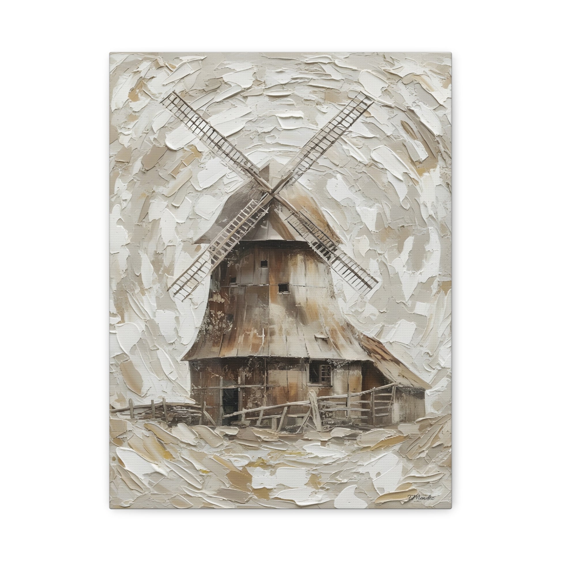 This piece, "The Sentinel of the Plains," captures the weathered soul of a traditional windmill standing tall against a swirling, textured sky. The composition is a masterclass in neutral tones—creams, ochres, and deep browns—creating a work of art that feels both ancient and timeless.
