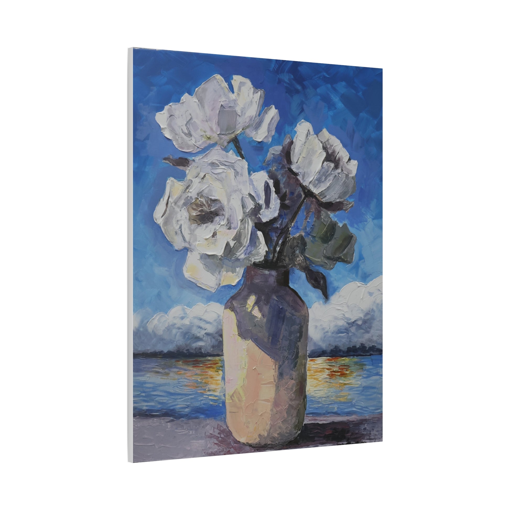 Capturing the light of a rustic sunset. This Hight Quatily Acrilic painting Copy from the Artemendez collection features a stunning bouquet of white flowers set against a deep cerulean sky. With a heavy impasto technique, each petal is sculpted in thick relief, creating a dramatic 3D effect that changes with the light in your room.