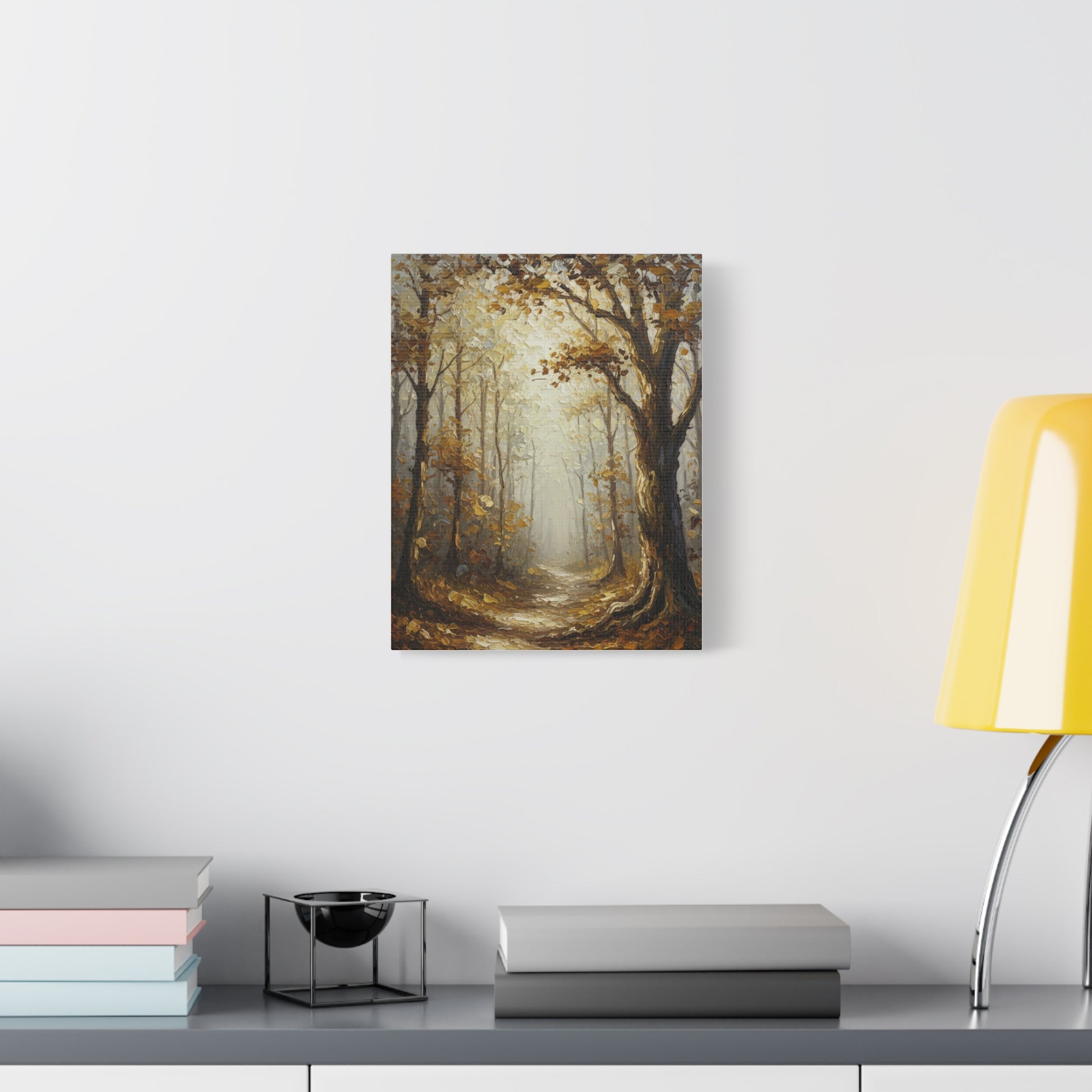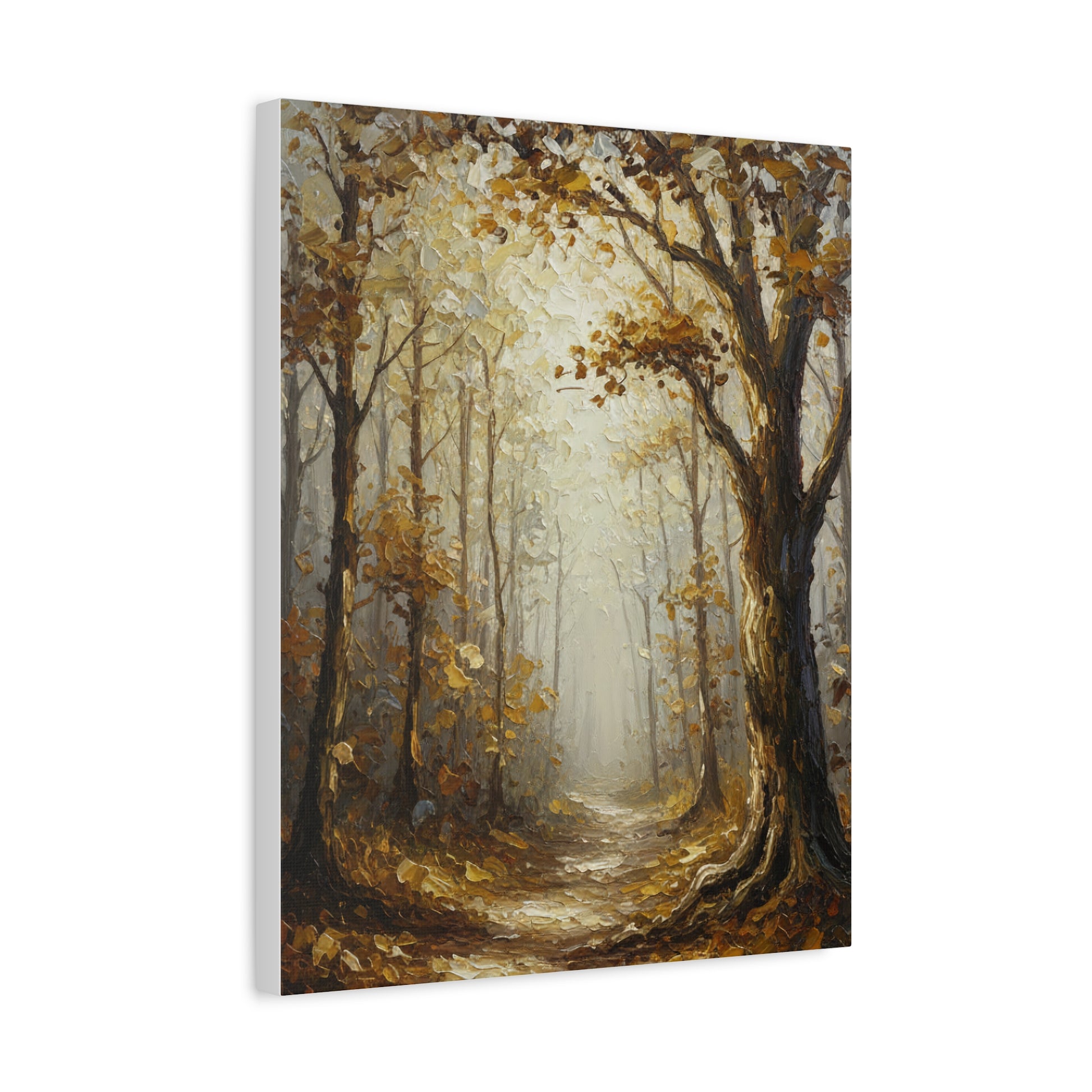 This stunning original acrylic painting captures the serene beauty of an autumn forest path bathed in golden light. The textured brushwork brings depth and movement to the scene, with warm amber and ochre tones creating a peaceful, contemplative atmosphere.