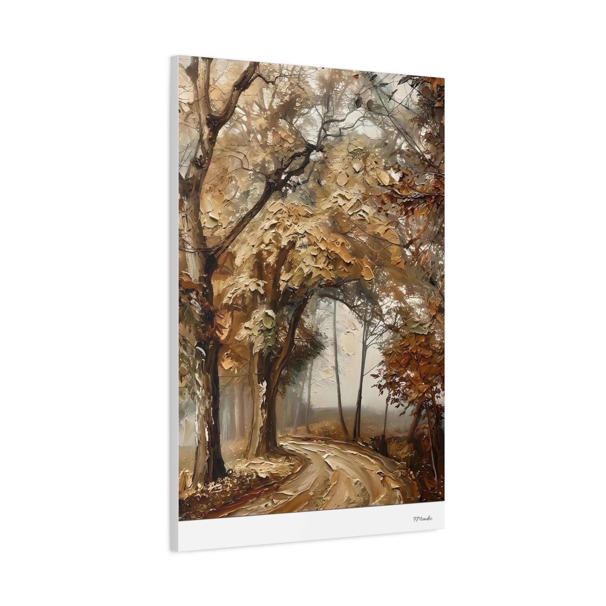The scene captures a winding path through a fog-shrouded forest, where golden and amber leaves seem to cascade from ancient trees. The interplay of light and shadow, combined with the dramatic texture, creates a sense of depth and atmosphere that draws you into this enchanted woodland.