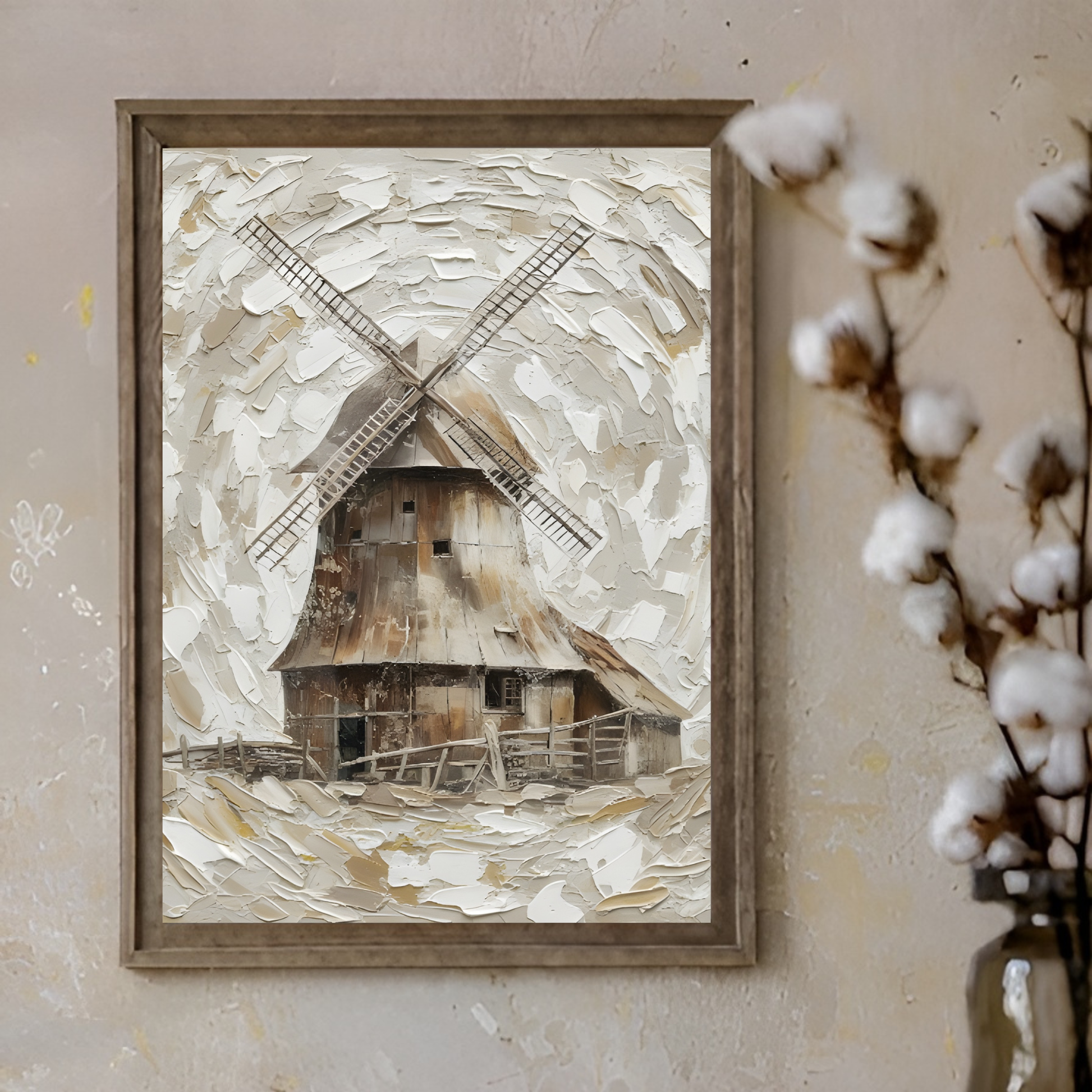 This Original piece, "The Sentinel of the Plains," captures the weathered soul of a traditional windmill standing tall against a swirling, textured sky. The composition is a masterclass in neutral tones—creams, ochres, and deep browns—creating a work of art that feels both ancient and timeless.